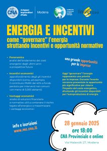 L’appuntamento è per martedì 28 gennaio 2025 alle ore 18:00, in modalità mista: presso la sede provinciale di CNA Modena (Via Malavolti, 27) e online.