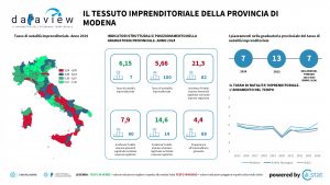 Nel 2024 Modena ha scalato la graduatoria provinciale per tasso di natalità imprenditoriale (6,15%) collocandosi al settimo posto, in netta risalita dal tredicesimo gradino guadagnato nel 2023. Inoltre, l’attuale piazzamento è il migliore da dieci anni a questa parte.