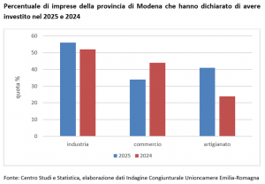 L’indagine congiunturale di Unioncamere Emilia-Romagna, elaborata dal Centro Studi e Statistica della Camera di Commercio, evidenzia per la provincia di Modena un incremento delle quote di imprese industriali e artigiane che hanno investito nel 2025 rispetto a quelle dell’anno precedente; una flessione si registra, invece, nel commercio.