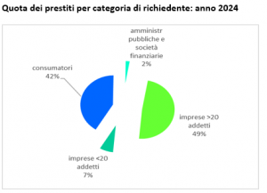 La manifattura riceve la maggior quota di finanziamenti (45,0% del totale imprese), tuttavia evidenzia una netta riduzione dei prestiti (-6,9%), le costruzioni subiscono un calo ancor più sensibile (-15,8%), mentre risulta in aumento la richiesta di fondi da parte dei servizi (+3,1%), in questo modo la loro quota arriva al 38,9%.