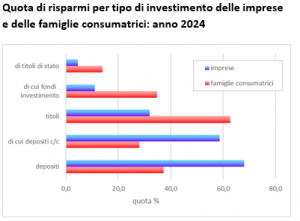 Solamente un quarto dei risparmi è detenuto dalle imprese, che conservano la maggioranza dei fondi in depositi, soprattutto in conto corrente, tuttavia, tali somme risultano in calo del 4,0%, i risparmi si spostano infatti verso l’acquisto di titoli (+63,4%), con un incremento notevole per i titoli di stato (+55,0%).
