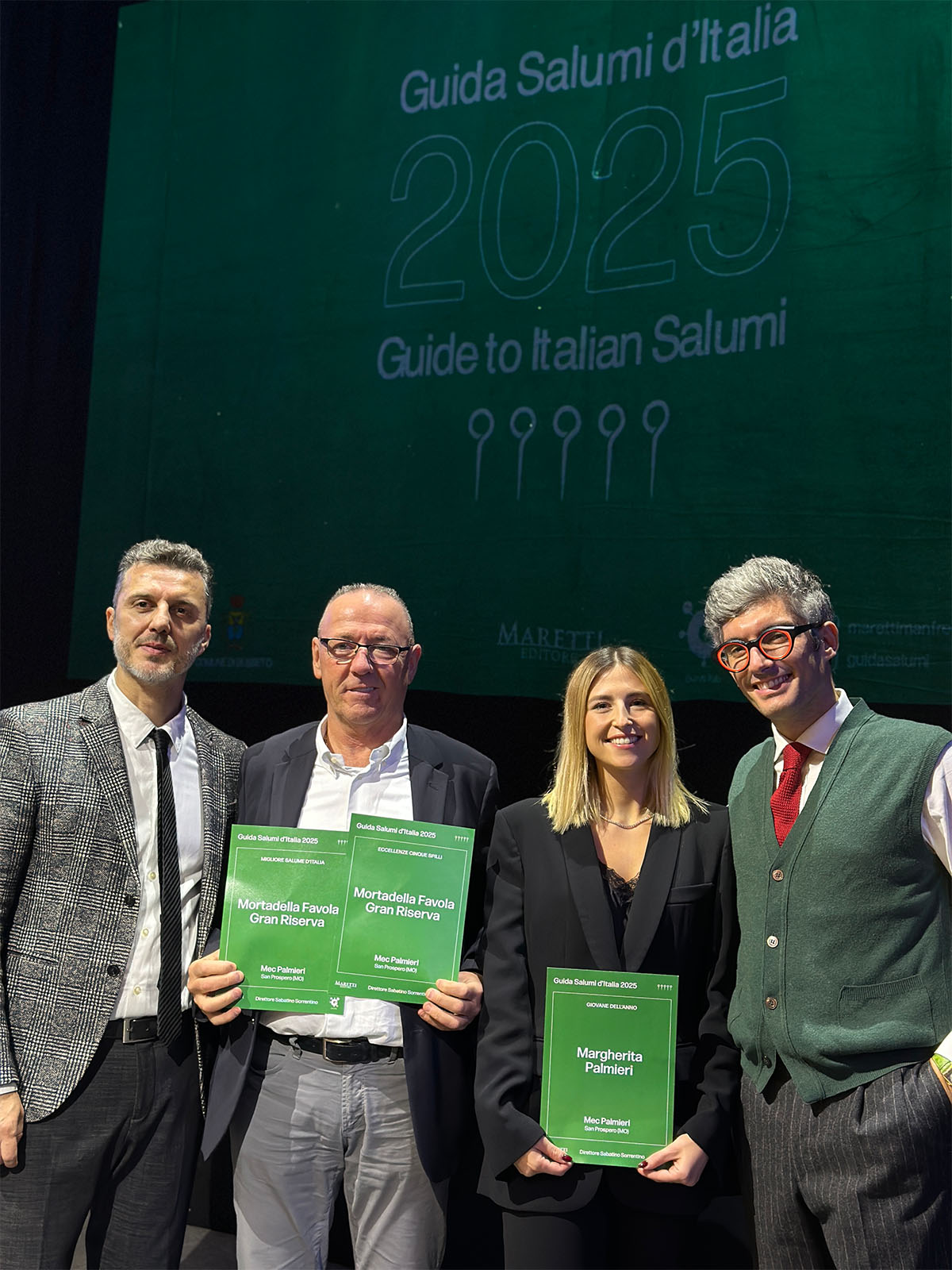 La Mortadella Favola Gran Riserva del Salumificio Mec Palmieri di San Prospero premiata come Migliore Salume d’Italia. La mortadella si aggiudica così ancora una volta i ‘Cinque Spilli’ tra le eccellenze: il riconoscimento più prestigioso assegnato dalla Guida Salumi d’Italia 2025 che recensisce e valorizza il mondo della norcineria e salumeria italiana. La cerimonia è