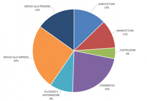 Risultano, invece, in contrazione i seguenti settori: il commercio (-2,9%) che rappresenta una quota del 22,4% del totale, l’agricoltura (-2,7%) che scende al 12,8% del totale e manifattura (-3,7%) con una quota dell’11,1%.