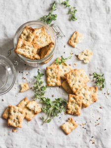 Salty sunflower seeds and thyme crackers on a light table, top v