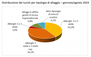 La maggior parte dei turisti pernotta negli esercizi alberghieri (81,0% del totale), in aumento dello 0,7%. Tra di essi è preponderante la permanenza negli alberghi più lussuosi, superiori alle tre stelle (77,1%).